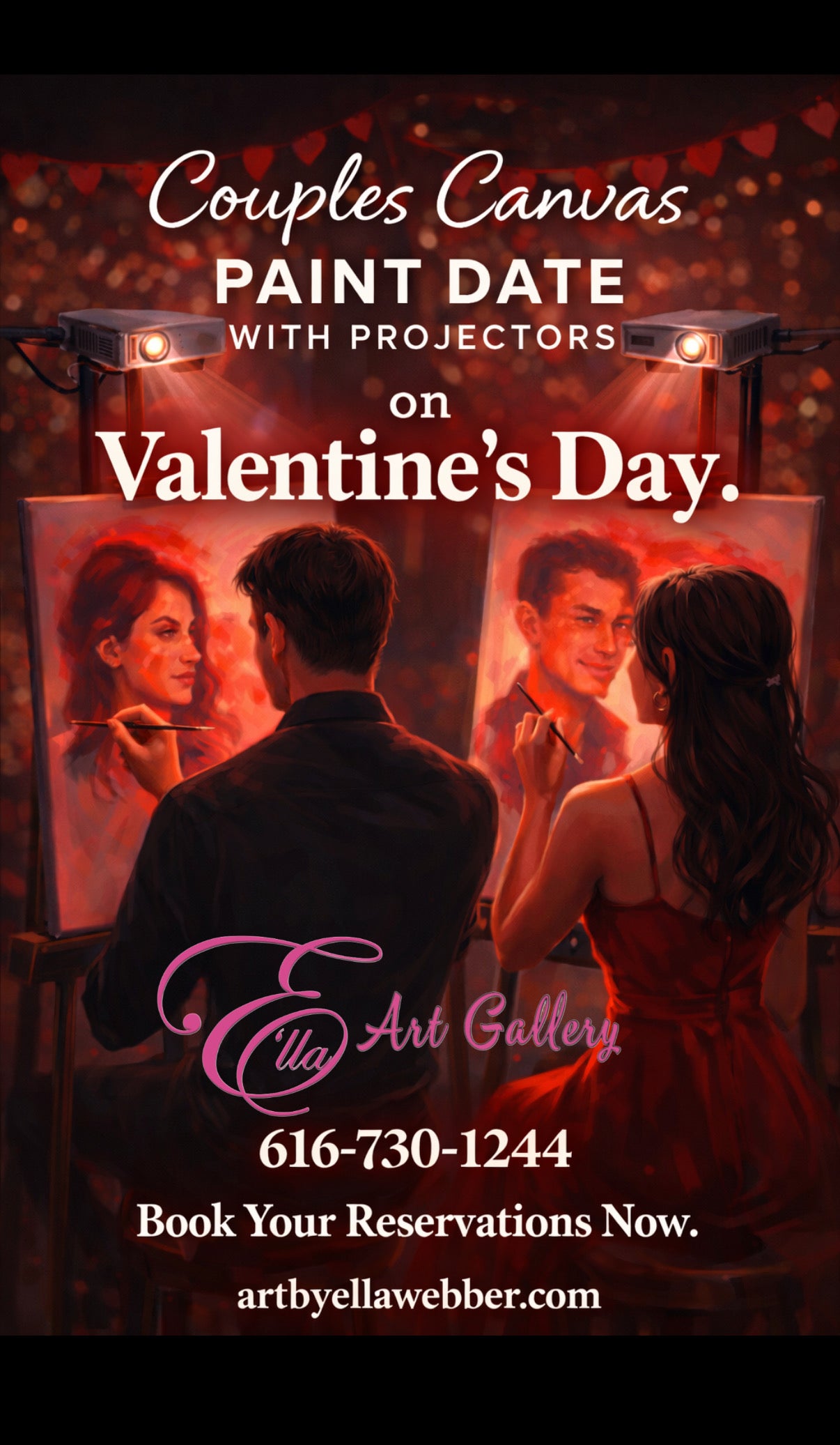 Feel free to dress to impress this Valentine’s Day and enjoy a creative date painting one another with the help of projectors to guide your journey. One drink and one snack included.